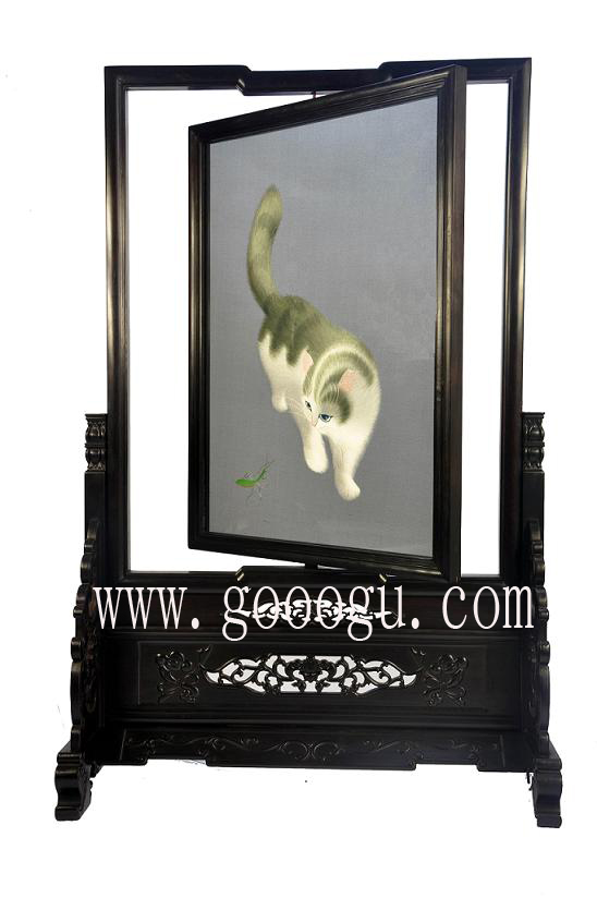 走進(jìn)嬌古蘇繡的展廳,我們驚嘆于陳列室里作品的浩繁與精致,先來看傳統(tǒng)題材的作品?;B繡是蘇繡傳統(tǒng)產(chǎn)品,它是明清時(shí)期閨閣繡的延續(xù)。蘇繡工藝品《小 貓》、《金魚》曾在國(guó)際上得獎(jiǎng),《小貓》的名氣在于貓眼用二十六種不同顏色的絲線繡成;《金魚》的輝煌則是魚尾最細(xì)處僅用一根線的四十八分之一。蘇州各大 旅游景點(diǎn)也屢見小貓金魚的姿態(tài),如何擺脫蘇繡工藝品的匠氣,使俗氣的工藝品成為震撼人心的藝術(shù)品,這是嬌古蘇繡多年來苦苦研究的問題。看,這幅現(xiàn)代 刺繡藝術(shù)品《貓》。同樣是貓,傳統(tǒng)的貓講究具體,形象,栩栩如生。而我們面前的兩幅《貓》:一幅白底白貓,一幅黑底黑貓。貓?jiān)谀睦??貓?jiān)诎咨铮堅(jiān)诤谏?里,貓?jiān)谀銦o盡的想像里。想像之上,具象已與抽象結(jié)合起來,達(dá)到了藝術(shù)升華。同是蘇繡作品,構(gòu)思變了,功底卻不改,《貓》作品之外給人的聯(lián)想可謂余音裊裊。 |