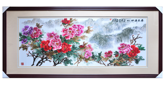 手工蘇繡成品牡丹掛畫客廳長兩米左右裝飾畫春色滿神州手繡畫