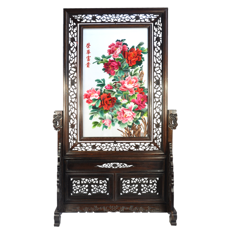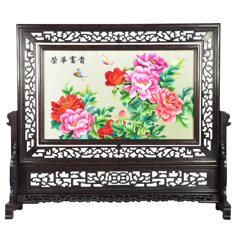 蘇繡富貴榮華擺件臺屏仿古實雕木架刺繡品臥室中式擺件