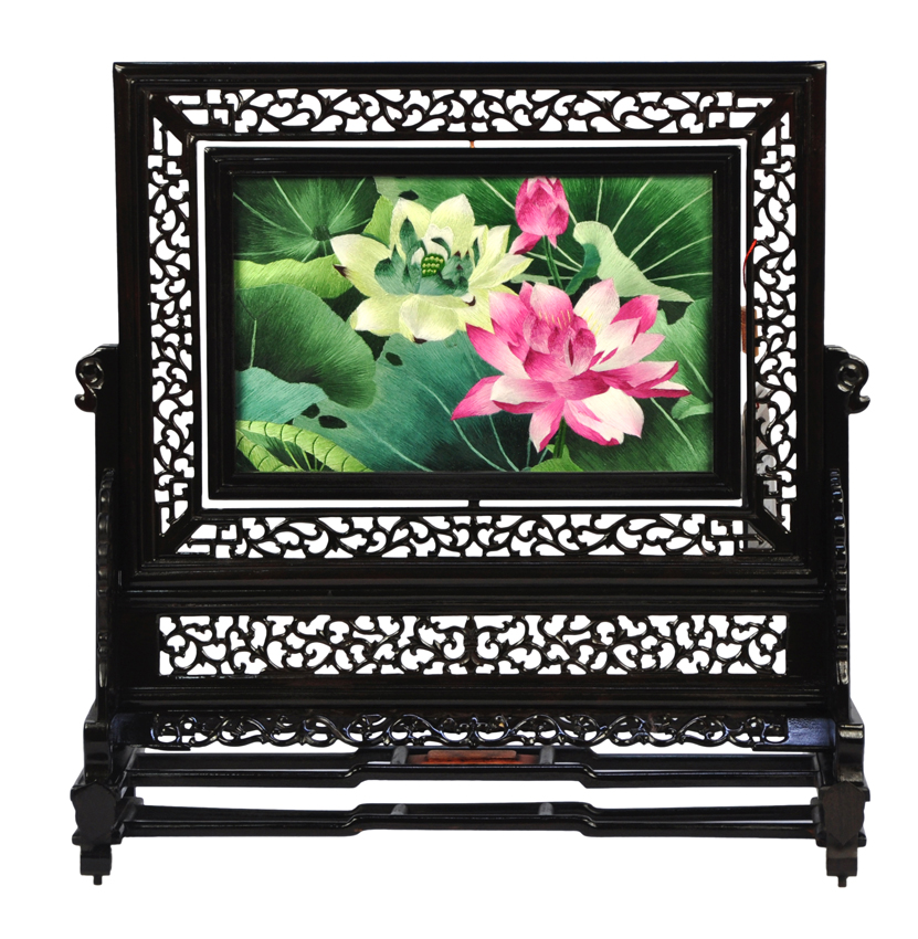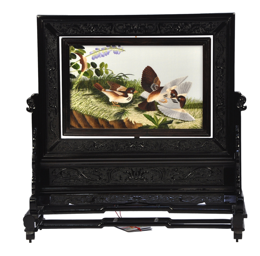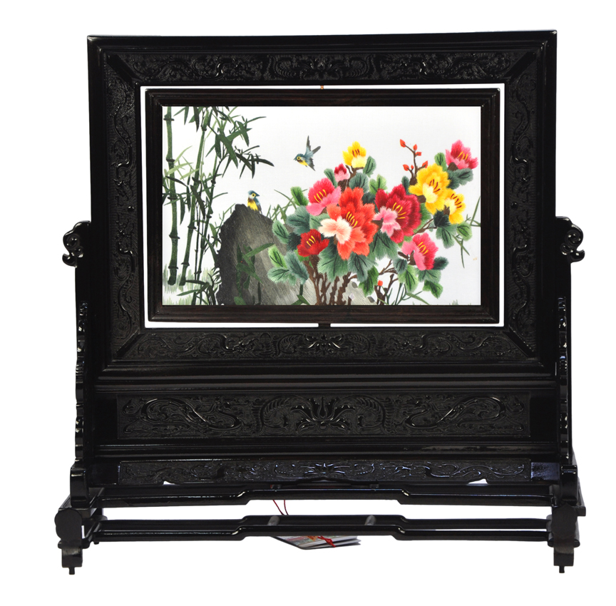 產(chǎn)品名稱:紫檀蘇州雙面繡 (作品代碼:SZ-7889) 產(chǎn)品規(guī)格:46X41CM(外框尺寸) 25X16CM(繡品尺寸) 產(chǎn)品工藝:蘇州繡娘手工刺繡。繡品圖案部分可360度旋轉(zhuǎn) 產(chǎn)品材質(zhì):真絲面料+桑蠶絲線+玻璃+紫光檀木架 產(chǎn)品包裝:錦盒禮品裝 嬌古出廠價:2800元/件 市場零售參考價:6000元左右 最小起訂量:1件----廠家直銷,可當天發(fā)貨(可混配圖案) 產(chǎn)品描述:紫光檀蘇州雙面繡為蘇州繡娘手工刺繡而成,木框為目前中國蘇州雙面繡材質(zhì)紫光檀,整體框架花紋雕刻細膩。圖案有花卉(牡丹,梅花,荷花,蘭花等),花鳥,動物(熊貓,老虎,魚等),山水,風景,名家字畫等。圖案多達一百多種,有古色古香的,有現(xiàn)代氣息的,高貴典雅,是贈送客人的特色禮品之一。 系列推薦