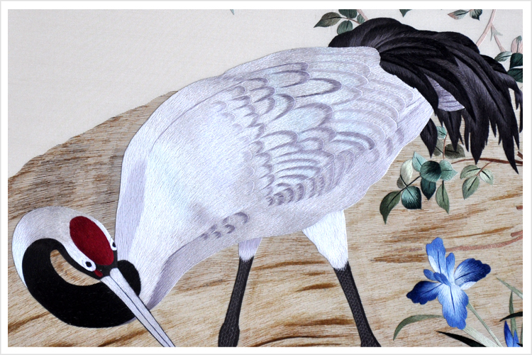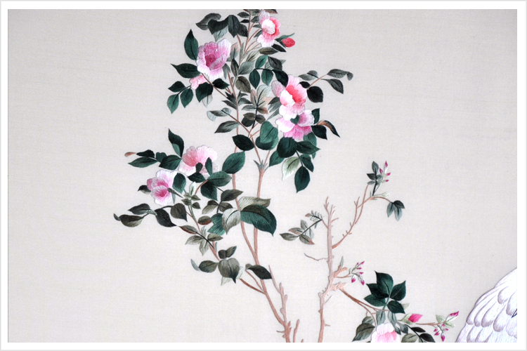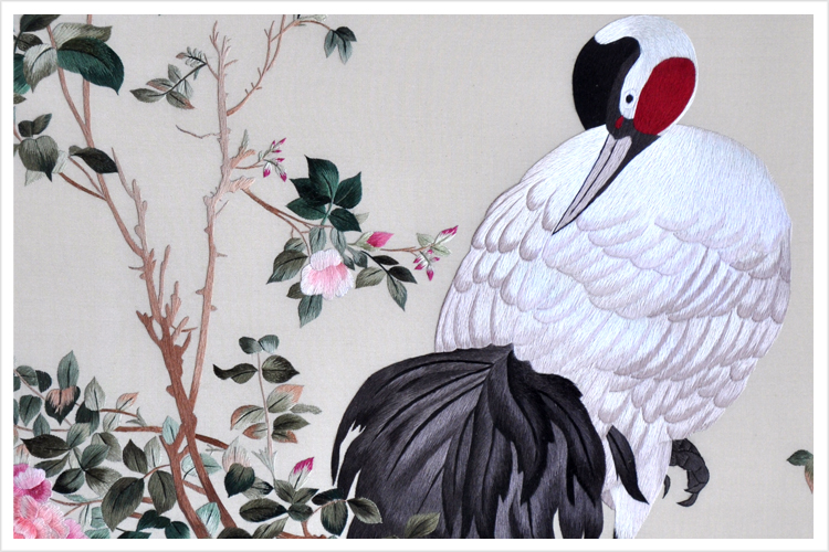 【品 牌】:嬌古 (作品代碼 D-1038) 【品 名】:郎世寧《花蔭雙鶴圖》裝飾畫(手工蘇繡) 【品 質(zhì)】:1-2絲刺繡 (蘇繡小知識:1根蘇繡絲線可分為16絲,中檔刺繡皆為10絲所繡,中高檔刺繡皆為6-8絲,高檔刺繡皆為4-6絲,精品刺繡皆為1-4絲) 【尺 寸】:畫心尺寸49*90cm 整體尺寸75*120cm 【產(chǎn)品工藝】:手工刺繡 【絲線材質(zhì)】:蠶絲線 【用 途】:居家裝飾及政府禮品、外賓禮品、生日禮物、賀壽禮品、領(lǐng)導(dǎo)升遷、出國禮品等等。 【出廠價格】:28000元 細(xì)節(jié)圖