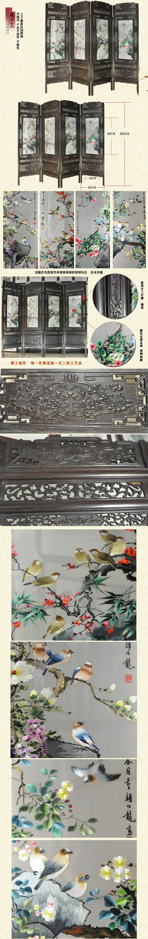 【產(chǎn)品名稱】:四扇花鳥(雙面繡) (作品代碼:zp-1502) 【產(chǎn)品規(guī)格】:圖案尺寸每扇寬度35cm,高度90cm 外框整體尺寸寬60cm,高205cm 【產(chǎn)品工藝】:手工刺繡 【產(chǎn)品材質(zhì)】:真絲面料+雞翅木+桑蠶絲線+玻璃 【產(chǎn)品包裝】:木箱包裝,用海綿包扎,確保運(yùn)輸安全 【出廠價(jià)】:22000元 【產(chǎn)品運(yùn)輸】:我司負(fù)責(zé)發(fā)往客戶指定地點(diǎn),蘇州附近城市可送貨上門! 【產(chǎn)品說明】:花鳥雙面繡折疊屏風(fēng),是由蘇州工藝師耗時(shí)數(shù)個(gè)月精心手工刺繡而成,刺繡圖案以花鳥為題材繡工精細(xì),簡約大方,顏色搭配均勻過渡自然,屏風(fēng)的框架選用進(jìn)口的雞翅木為料,是蘇繡屏風(fēng)中的經(jīng)典作品。是居家和辦公的重要裝飾品之一!歡迎親臨嬌古蘇繡展示廳觀看實(shí)物! .jpg)