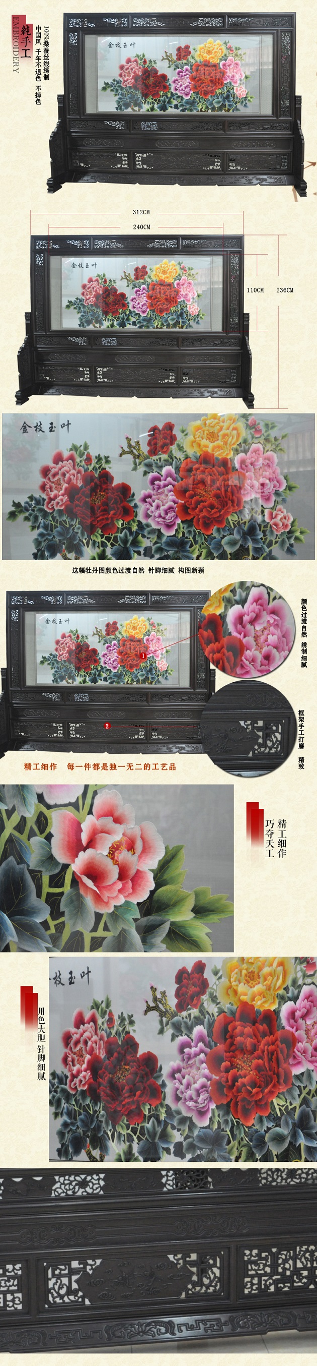 【產(chǎn)品名稱】:金枝玉葉(雙面繡) (作品代碼:p-1527) 【產(chǎn)品規(guī)格】:圖案尺寸寬度240cm,高度110cm 外框整體尺寸寬312cm,高236cm 【產(chǎn)品工藝】:手工刺繡 【產(chǎn)品材質(zhì)】:真絲面料+雞翅木+桑蠶絲線+玻璃 【產(chǎn)品包裝】:木箱包裝,用海綿包扎,確保運輸安全 【出廠價】:58800元 【產(chǎn)品運輸】:我司負責發(fā)往客戶指定地點,蘇州附近城市可送貨上門! 【產(chǎn)品說明】:金枝玉葉雙面繡屏風,是由蘇州工藝師耗時數(shù)個月精心手工刺繡而成,刺繡圖案以國花牡丹為題材繡工精細,簡約大方,顏色搭配均勻過渡自然,屏風的框架選用進口的天然雞翅木為料,是蘇繡屏風中的經(jīng)典作品。是居家和辦公的重要裝飾品之一!歡迎親臨嬌古蘇繡展示廳觀看實物! .jpg)